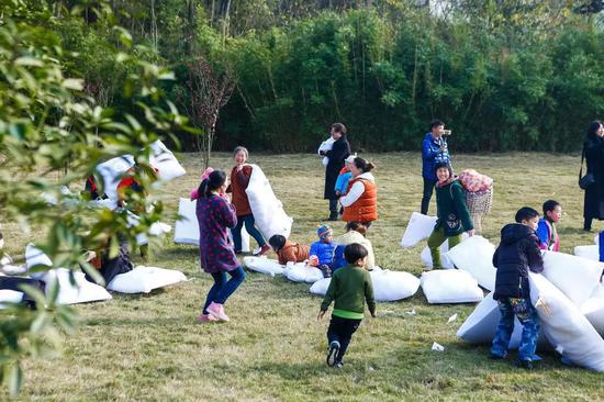 守望原乡“2018广安田野双年展”李波作品《浮土》事实上,“守望原乡:广安田野双年展”正是在展览现场构成了一次前所未有的“对话”——当代艺术与传统的乡村文化的对话、当代艺术与田野的对话,以及当代艺术与村民的对话。作为展场的宝箴塞和段家大院,是传统的乡村文化的杰出代表,建筑本身的完美使每一位当代艺术家不无敬畏之心,当他们的作品置入这样的场域,就自然形成一次传统文化与当代艺术的博弈和较量;当作品置入乡村田野和天然环境之中,艺术家就不得不 寻找他们的作品和田野和大地之间的内在联系,否则他们的作品就没有理由置放在这里,这就构成了艺术和它呈现的环境之间的对话;第三,这些闯入田野和公共空间的作品也必然要和当地的村民产生联系。事实证明,那些村民可以直接参与其中的作品成为最受欢迎的作品。甚至变成了当地村民的一次集体狂欢。从另一角度看,也是当代艺术对村民的一次成功“入侵”。