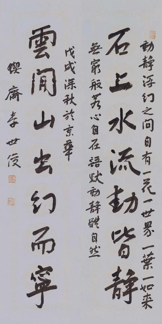 “书法是我一生的追求,占据了我业余生活的全部。”李世俊认为,书法不仅是一种书写的艺术,还是一种抒情的艺术,更是一种人生的修养方式。他从早期开始便从碑学上下功夫,以碑学书法为体,兼收“二王”帖学的韵律,张弛有度,追求一种平和自然、蕴藉沉着、劲健绮丽、豪放缜密的境界。上海书协顾问、上海博物馆研究员刘一闻认为,李世俊的作品笔简意足,意境微妙,清远纯净,以脱尘境界的简远笔墨作开示,体现了一种不立文字直指本心的直观简约主义思想和卓尔不群的碑文风骨。“从他的书法作品里会看到激情,看到他为人的豪迈刚毅,看到一种深度的优雅与修养,看到一个勤奋的耕耘者,看到一个潇洒的艺术家。”