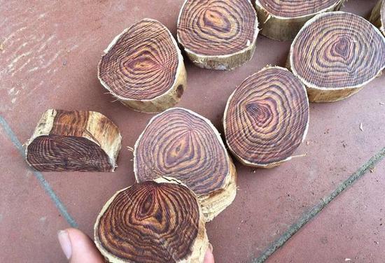 一路上我都一直纳闷的很,这是在我身上找成就感来了。到了加工厂就直接叫师傅下面也切开了。一看这面朋友高兴的都跳起来了,说这是海南黄花梨蜘蛛纹的,绝对熟透了。又说这种海南黄花梨蜘蛛纹简直就是尤物,反正我是看不懂只看他一个劲的跳。