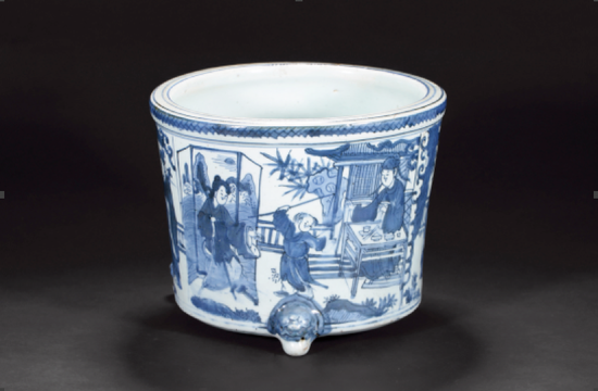 “古董珍玩——瓷器?玉器?杂项?家具”专场,汇集历代瓷器、玉器、银器、文房雅玩、佛造像、古旧家具以及各类材质的精美拍品200余件,供各门类藏家甄选。本专场第72号标的,明?万历青花人物纹三足炉:炉内光素无纹,炉心未施釉,书“羅”字,炉外壁饰青花人物纹。炉底边画两条青花弦纹。腹部画青花人物故事。造型简练古朴,青花发色层次分明。