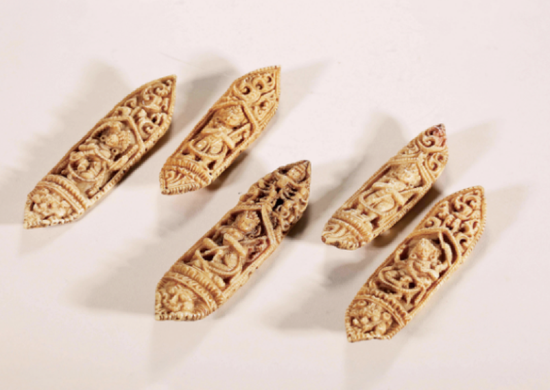 高:17cm第163号标的,西藏高僧骨雕菩萨饰件,是西藏高僧在其所信仰的宗教仪式中所穿戴的璎珞衣上的饰件。骨雕以高浮雕手法雕刻出主尊空行母及其护法。主尊空行母舞蹈于莲座上,右手持金刚钺刀,左手擎盈血颅器,左肩斜依卡章嘎天杖,莲座下饰护法狮子,骨牌上方饰大鹏金翅鸟等。空行母及其护法骨牌雕刻生动传神,其工艺明显带有尼泊尔工艺特征。空行母,梵音译为“荼吉尼”(DAKINI),意为在空中行走的女性神祇,她有大力,可于空中飞行,在藏传佛教的密宗中,空行母是代表智慧与慈悲的女神。